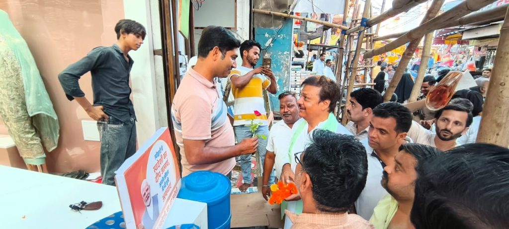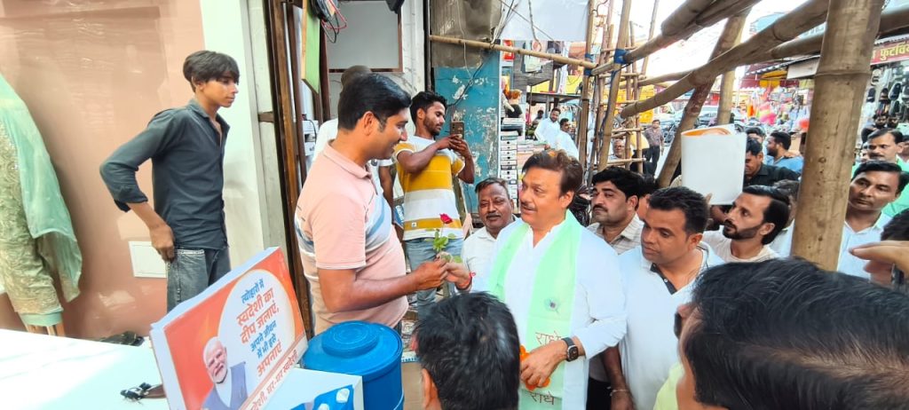आत्मनिर्भर भारत का रास्ता अपनाना है। आदि से संबंधित स्लोगन स्टीकर व गुलाब का फूल दुकानदार व्यापारियों को दिया।