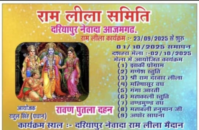 आजमगढ़ मेहनाजपुर / सूरज सिंह – आजमगढ़ जिले के तरवां ब्लॉक स्थित दरियापुर नेवादा मे रामलीला मैदान रामलीला का मंचन किया जा रहा है | सैकड़ों वर्षों से चली आ रही इस रामलीला की परंपरा न केवल धार्मिक आस्था से जुड़ी है, बल्कि इस क्षेत्र की सांस्कृतिक पहचान भी बन चुकी है. इस भव्य आयोजन को देखने के लिए आसपास से बड़ी संख्या में श्रद्धालु और दर्शक पहुंचते हैं| रामायण पर आधारित इस रामलीला का मंचन अत्यंत भव्यता के साथ होता है. लंका, पंचवटी, पम्पापूरी, अशोक वाटिका जैसी स्थायी संरचनाएं रामलीला को जीवंत बनाती हैं. राम, सीता, लक्ष्मण, रावण आदि जैसे रामायण के पात्र स्थानीय कलाकारों द्वारा निभाए जाते हैं, जो इसे और अधिक जीवंतता प्रदान करते हैं. कलाकारों की संवाद अदायगी और पारंपरिक वेशभूषा दर्शकों को रामायण काल में की अनुभूति कराती हैं |