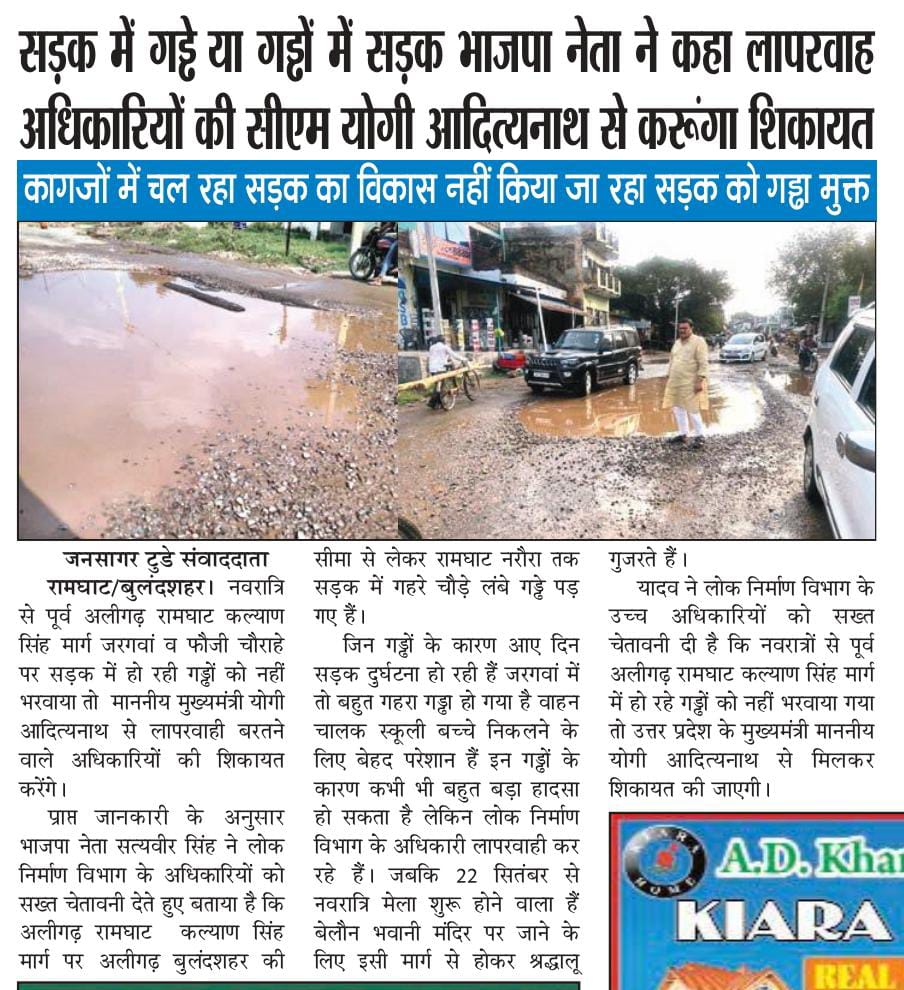 आपको बता दे अलीगढ़ बुलंदशहर की सीमा से लेकर रामघाट नरौरा तक बरसात के कारण जरगवां फौजी चौराहे आदि सड़क में जगह जगह गड्ढें पड़ गए थे जिसके कारण स्कूली बच्चे व वाहन चालक बहुत परेशान थे इसकी शिकायत भाजपा नेता सत्यवीर सिंह यादव  ने लोक निर्माण विभाग के एक्शयन प्रताप सिंह बुलंदशहर से की थी इस खबर को दैनिक जन सागर टुडे अखबार ने प्रमुखता से प्रकाशित किया गया था लोक निर्माण विभाग के अधिकारियों ने खबर को संज्ञान में लेते हुए सड़क में हो रहे गड्ढों को भरने का निर्माण कार्य शुरू करा दिया ग्रामीण जनता ने रामघाट संवाददाता जेपी गौतम का आभार व्यक्त किया है।