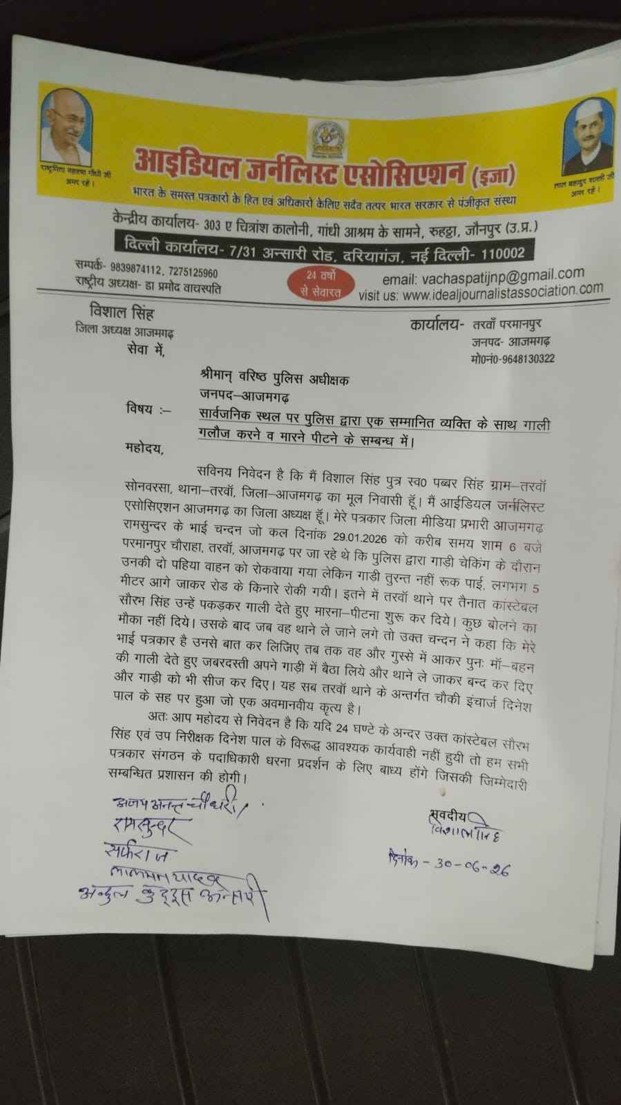 आजमगढ़ – आजमगढ़ जिले के तरवां थाना क्षेत्र का मामला प्रकाश में आया है बताते चलें कि वाहन चेकिंग के दौरान एक युवक अपने दो पहिया वाहन से आ रहा था जैसे ही परमानपुर चौराहे पर पहुंचा तो कांस्टेबल सौरभ सिंह उप निरीक्षक दिनेश पाल ने गाड़ी रुकवाया युवक गाड़ी लगभग 5 मीटर दूरी जाकर सड़क के किनारे गाड़ी रोक दिया यह उनका नागवार लग गया और युवक के पास पहुंच कर बिना कुछ जांचे पूछे कांस्टेबल सौरभ सिंह ने गाली देते हुए ताबड़तोड़ मारना शुरू कर दिया मारपीट के दौरान युवक ने कहा कि मैं अच्छे परिवार से हूं मेरे भाई पत्रकार हैं मैं अपने भाई से बात करता हूं लेकिन कांस्टेबल ने युवक की एक भी ना सुनी गाली देते हुए गाड़ी में बैठा कर थाने ले जाकर थाने में बंद कर दिया जिसको लेकर आइडियल जर्नलिस्ट एसोसिएशन के जिला अध्यक्ष विशाल सिंह ने अपने पदाधिकारीयों सहित पुलिस अधीक्षक आजमगढ़ को ज्ञापन दिया और कहा कि अगर इस पर 24 घंटे के अंदर कार्रवाई नहीं होती है तो हम अपने पदाधिकारीयों के साथ धरना प्रदर्शन करने के लिए बाध्य होंगे जिसकी जिम्मेदारी संबंधित प्रशासन की होगी