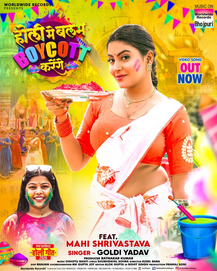 रंग बिरंगी होली पर्व की शुरुआत बसंत पंचमी से ही हो जाती है और पूरा फाल्गुन का महीना फगुआमय रहता है। रंगों से भरपूर यह होली का पर्व मस्ती भरा बहुत ही रोमांटिक होता है। ऐसे में वर्ल्डवाइड रिकॉर्ड्स कंपनी के एमडी रत्नाकर कुमार ने इस साल का पहला होली गीत ‘होली में बलम बायकॉट करेंगे’ ऑडियंस के बीच लेकर आये हैं। इसके वीडियो में भोजपुरी फिल्म इंडस्ट्री और भोजपुरी अल्बम इंडस्ट्री में एक साथ अपनी गहरी पैठ बना चुकी बेस्ट एक्ट्रेस माही श्रीवास्तव करोड़ो दिलों धड़कन बढ़ा रही हैं। वो अपनी कातिल अदाओं से होली की मस्ती भरे रंगों से सराबोर कर रही हैं। इस गीत को फेमस सिंगर गोल्डी यादव ने अपनी मधुर आवाज गाकर सबका मन मोह लिया है। ये होली गीत वर्ल्डवाइड रिकॉर्ड्स भोजपुरी के ऑफिसियल यूट्यूब चैनल पर रिलीज किया गया है।