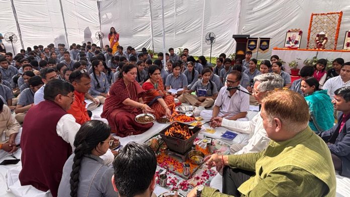 कार्यक्रम के दौरान विद्वान आचार्यों द्वारा वैदिक मंत्रों का उच्चारण किया गया, जिससे पूरा वातावरण भक्तिमय और सकारात्मक ऊर्जा से भर गया। इसके बाद विद्यार्थियों के उज्ज्वल भविष्य और बेहतर शिक्षा के लिए प्रार्थना की गई।