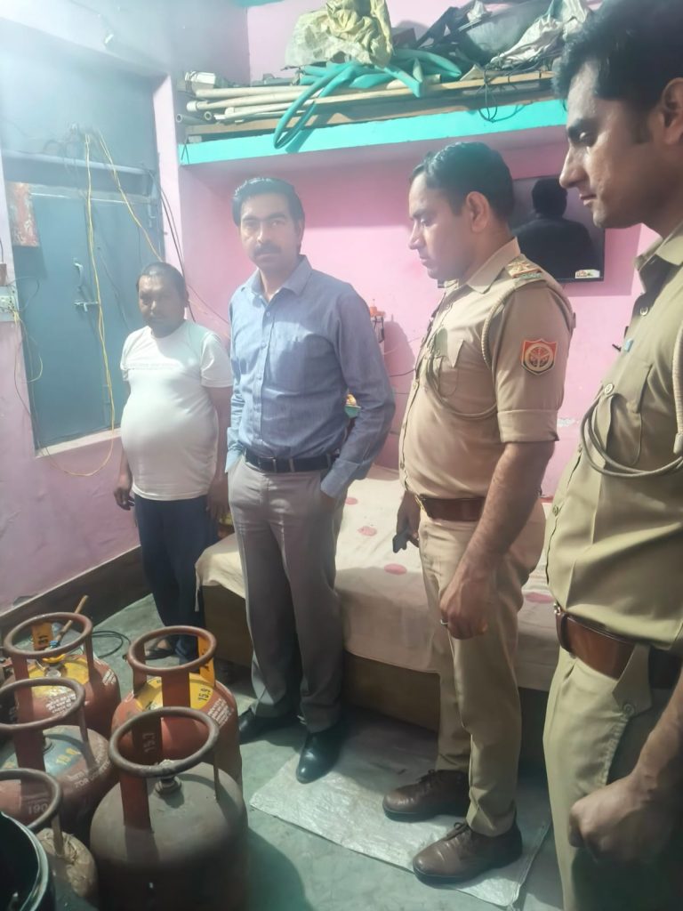 *गौतमबुद्धनगर,प्रभारी जिला पूर्ति अधिकारी स्मृति गौतम ने जानकारी देते हुए बताया कि विगत 4 अप्रैल की शाम लगभग 05:00 बजे आपूर्ति विभाग एवं पुलिस विभाग की संयुक्त टीम द्वारा थाना दादरी क्षेत्रान्तर्गत नत्थू चौक, तुलसी विहार कालोनी स्थित विनय कुमार पुत्र सूरजपाल के मकान पर छापेमारी की गयी। कार्यवाही के दौरान मौके से भारत पेट्रोलियम (बी.पी.सी.एल.) के 02 भरे घरेलू गैस सिलेण्डर (14.2 कि०ग्रा०) क्रमांक-43123एस व 44783, 02 खाली घरेलू सिलेण्डर (14.2 कि०ग्रा०) क्रमांक-576269टी व 134136एस बरामद किए गए तथा इण्डेन (आई.ओ.सी.एल.) के 06 खाली घरेलू गैस सिलेण्डर (14.2 कि०ग्रा०) क्रमांक-61154, 433751एस, 250907एस, 71529टी, 042780टी व 260850 तथा हिन्दुस्तान पेट्रोलियम (एच.पी.सी.एल.) के 03 खाली घरेलू गैस सिलेण्डर (14.2 कि०ग्रा०) क्रमांक-171514टी, 101531एस व 55382 भी मौके से बरामद किए गए। इसके अतिरिक्त एक 05 कि०ग्रा० का छोटा सिलेण्डर (नॉन-आई.एस.आई. मार्का) तथा गैस रिफिलिंग के अवैध कारोबार में प्रयुक्त होने वाले उपकरण, जिनमें एक इलेक्ट्रॉनिक वेइंग मशीन, लोहे एवं पीतल का रिफिलिंग नोजल युक्त मशीन तथा लगभग एक मीटर लंबी रबर पाइप सहित रेगुलेटर शामिल हैं, भी जब्त किए गए।