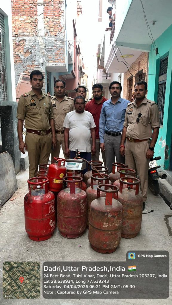 *गौतमबुद्धनगर,प्रभारी जिला पूर्ति अधिकारी स्मृति गौतम ने जानकारी देते हुए बताया कि विगत 4 अप्रैल की शाम लगभग 05:00 बजे आपूर्ति विभाग एवं पुलिस विभाग की संयुक्त टीम द्वारा थाना दादरी क्षेत्रान्तर्गत नत्थू चौक, तुलसी विहार कालोनी स्थित विनय कुमार पुत्र सूरजपाल के मकान पर छापेमारी की गयी। कार्यवाही के दौरान मौके से भारत पेट्रोलियम (बी.पी.सी.एल.) के 02 भरे घरेलू गैस सिलेण्डर (14.2 कि०ग्रा०) क्रमांक-43123एस व 44783, 02 खाली घरेलू सिलेण्डर (14.2 कि०ग्रा०) क्रमांक-576269टी व 134136एस बरामद किए गए तथा इण्डेन (आई.ओ.सी.एल.) के 06 खाली घरेलू गैस सिलेण्डर (14.2 कि०ग्रा०) क्रमांक-61154, 433751एस, 250907एस, 71529टी, 042780टी व 260850 तथा हिन्दुस्तान पेट्रोलियम (एच.पी.सी.एल.) के 03 खाली घरेलू गैस सिलेण्डर (14.2 कि०ग्रा०) क्रमांक-171514टी, 101531एस व 55382 भी मौके से बरामद किए गए। इसके अतिरिक्त एक 05 कि०ग्रा० का छोटा सिलेण्डर (नॉन-आई.एस.आई. मार्का) तथा गैस रिफिलिंग के अवैध कारोबार में प्रयुक्त होने वाले उपकरण, जिनमें एक इलेक्ट्रॉनिक वेइंग मशीन, लोहे एवं पीतल का रिफिलिंग नोजल युक्त मशीन तथा लगभग एक मीटर लंबी रबर पाइप सहित रेगुलेटर शामिल हैं, भी जब्त किए गए।